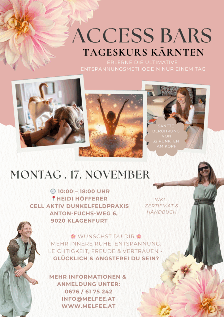 Stell dir vor… Du könntest Stress loslassen, alte Muster hinter dir lassen und Raum für neue Möglichkeiten schaffen – in deinem LiEBEN und deinem Business. Der Access Bars® Tageskurs bietet dir genau das. Danach kannst du die Bars bei deiner Familie, deinen Freunden oder auch gewerblich anwenden. Wieviel mehr Leichtigkeit würden die Bars in deine Welt einladen?