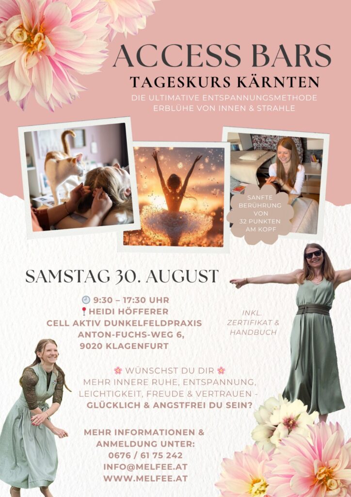 Stell dir vor… Du könntest Stress loslassen, alte Muster hinter dir lassen und Raum für neue Möglichkeiten schaffen – in deinem LiEBEN und deinem Business. Der Access Bars® Tageskurs bietet dir genau das. Danach kannst du die Bars bei deiner Familie, deinen Freunden oder auch gewerblich anwenden. Wieviel mehr Leichtigkeit würden die Bars in deine Welt einladen?