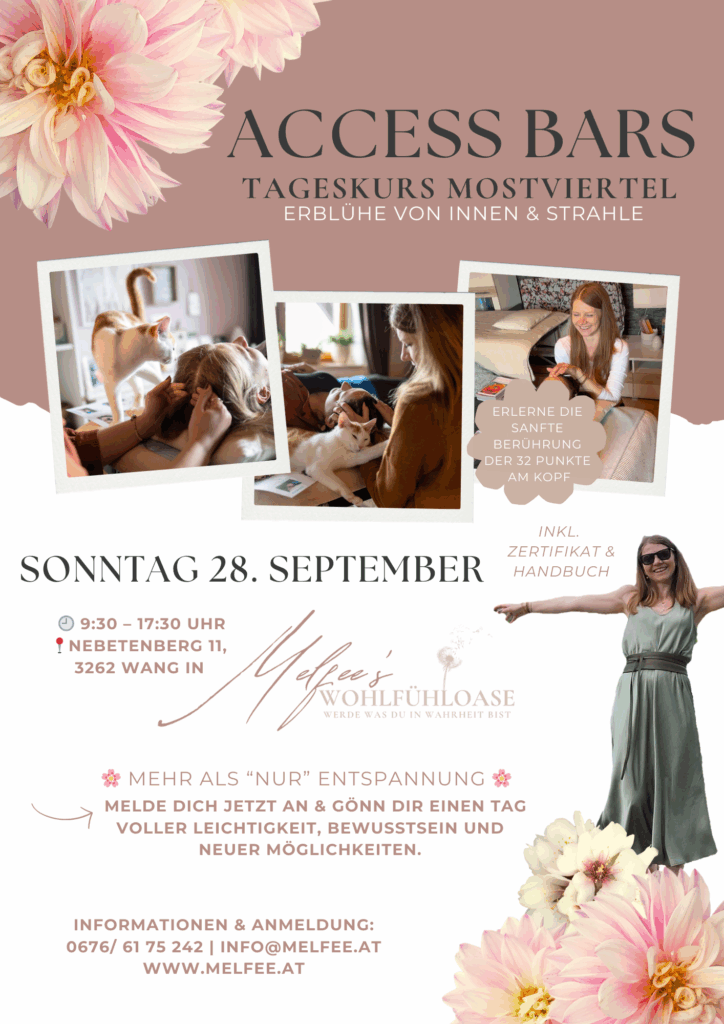 Stell dir vor… Du könntest Stress loslassen, alte Muster hinter dir lassen und Raum für neue Möglichkeiten schaffen – in deinem LiEBEN und deinem Business. Der Access Bars® Tageskurs bietet dir genau das. Danach kannst du die Bars bei deiner Familie, deinen Freunden oder auch gewerblich anwenden. Wieviel mehr Leichtigkeit würden die Bars in deine Welt einladen?