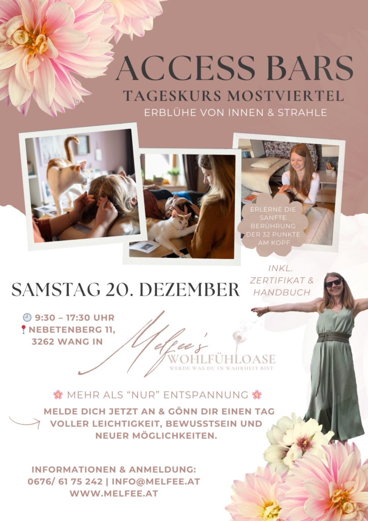 Stell dir vor… Du könntest Stress loslassen, alte Muster hinter dir lassen und Raum für neue Möglichkeiten schaffen – in deinem LiEBEN und deinem Business. Der Access Bars® Tageskurs bietet dir genau das. Danach kannst du die Bars bei deiner Familie, deinen Freunden oder auch gewerblich anwenden. Wieviel mehr Leichtigkeit würden die Bars in deine Welt einladen?