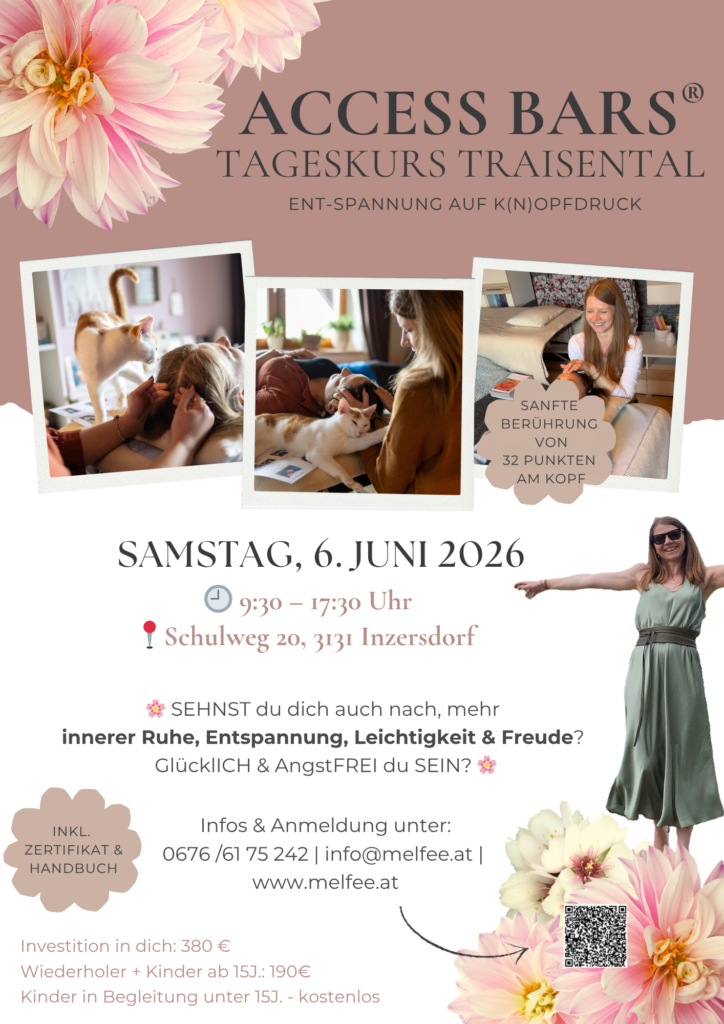 Stell dir vor… Du könntest Stress loslassen, alte Muster hinter dir lassen und Raum für neue Möglichkeiten schaffen – in deinem LiEBEN und deinem Business. Der Access Bars® Tageskurs bietet dir genau das. Danach kannst du die Bars bei deiner Familie, deinen Freunden oder auch gewerblich anwenden. Wieviel mehr Leichtigkeit würden die Bars in deine Welt einladen?